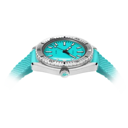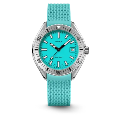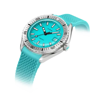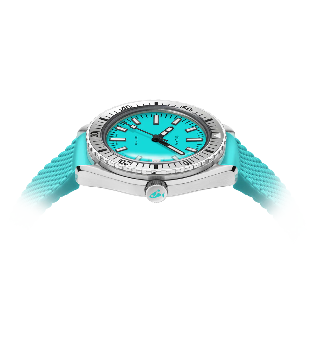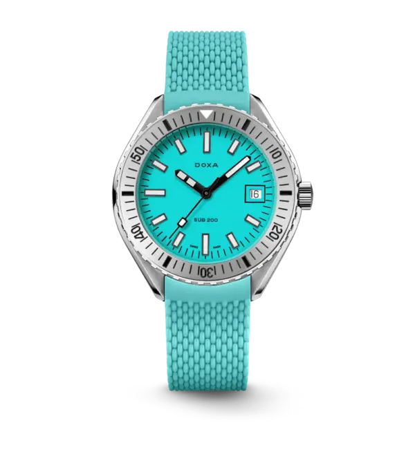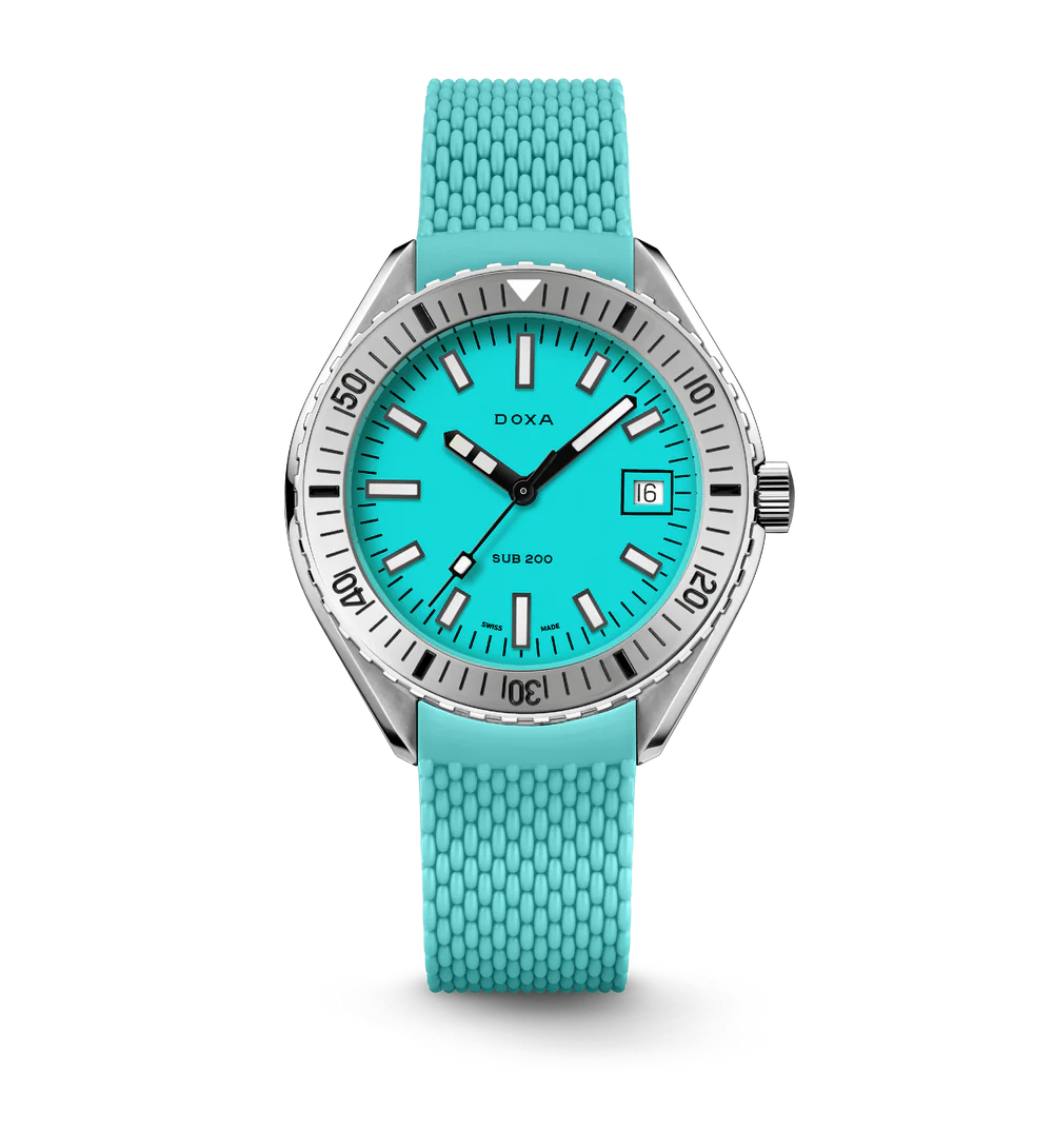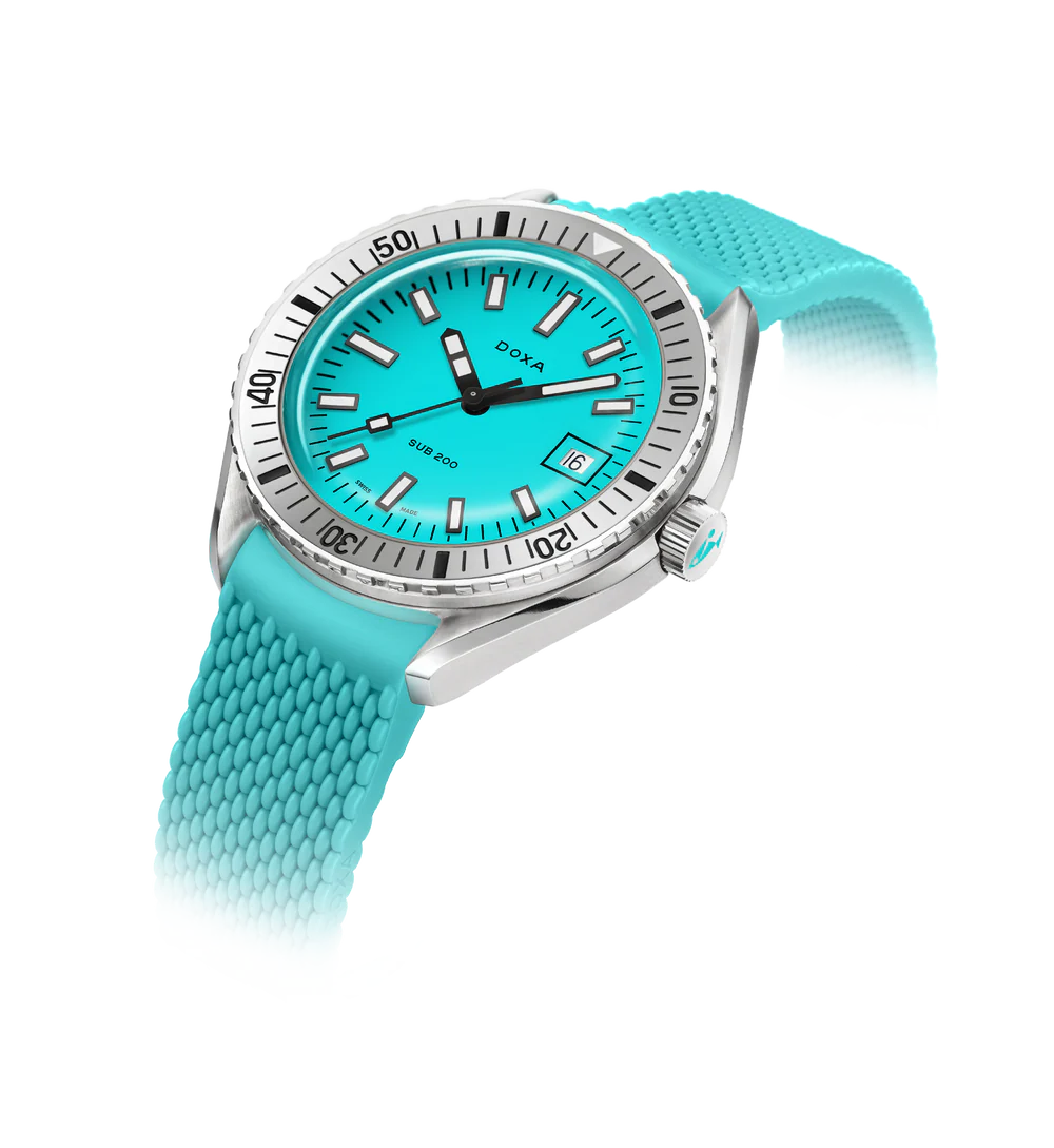 Unveiled at Baselworld 2019, this 3-hand diver’s watch has a case made of highest-quality 316L stainless steel. At a diameter of 42 mm, the SUB 200 is topped by a scratch-resistant sapphire crystal with an anti-reflective coating and the distinctive curvature of the domed plexiglass used back in the day. Waterproof to a depth of 200 meters (20 ATM), the model features a unidirectional rotating bezel. All the elements providing dive-relevant information, including the bezel, have a Super‑LumiNova® luminescent coating. The bracelet is 316L stainless steel and features a folding clasp with the DOXA fish symbol.