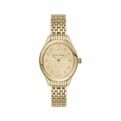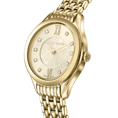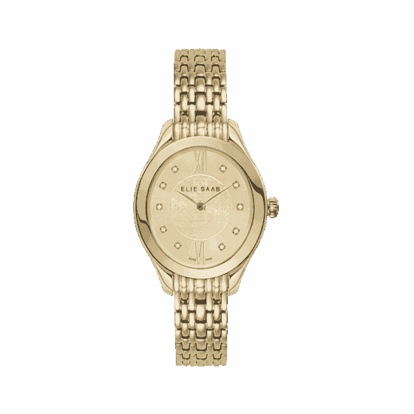 The watch features a gold Sapphire dial adorned with 10 brilliant VS-1 diamonds at the hour indices, adding a touch of luxury without overwhelming the refined design. The gold-plated case is complemented by a matching gold-plated bezel and a link-style bracelet, which gracefully contours to the wrist for a comfortable yet striking presence.