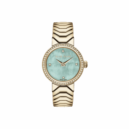 The gold plated bezel and classic patterned band complement the Sapphire glass and light green mother-of-pearl dial, with 64 diamonds on the bezel and index.