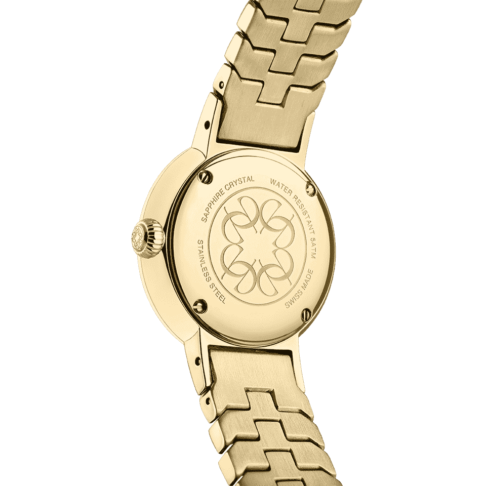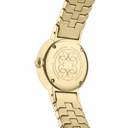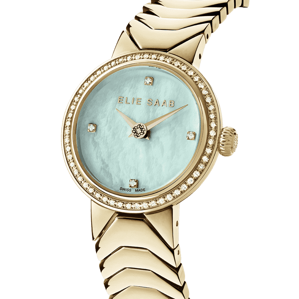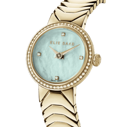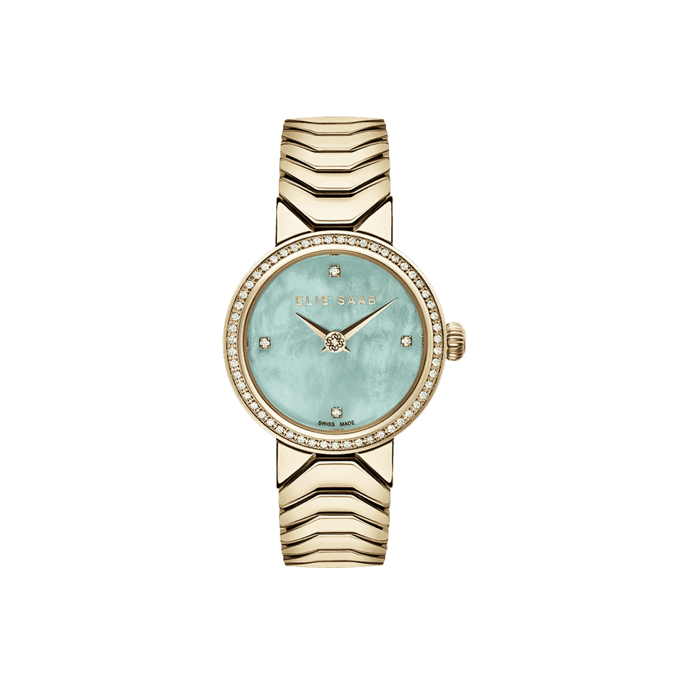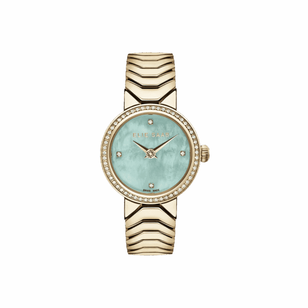 This enchanting 27mm Swiss-movement watch is specially crafted for those who love creations which embody glamour, style and impeccable craftsmanship. The gold plated bezel and a classic patterned band complement the Sapphire glass and light green mother-of-pearl dial, with 64 diamonds on the bezel and index. The look is completed by the butterfly buckle and gold plated case. Water resistance is 5 ATM. Diamond Clarity is VS-1.