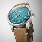 The Oris Big Crown x Cervo Volante in blue features a 38mm stainless steel case, an Alpine-inspired blue dial, and a sustainably sourced deer leather strap. Powered by automatic Calibre 754 with a 38-hour power reserve, it comes with a special box and certificate.