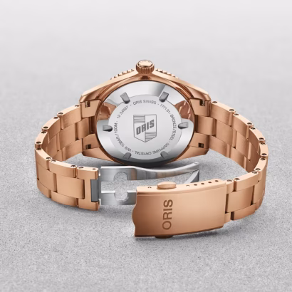 Encased in a 38mm multi-piece bronze case, the watch is fitted with a bronze minute-scale top ring and a domed sapphire crystal that’s anti-reflective on the inside, ensuring clarity and durability. The stainless steel screwed case back features special engravings, a subtle nod to Oris’s heritage and attention to detail.