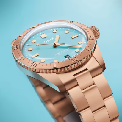 The Oris Divers Sixty-Five “Cotton Candy” Blue Dial Bronze Bracelet is a vibrant celebration of craftsmanship, colour, and positivity. Designed to evoke warmth and joy, it features an all-bronze construction — including the case, bezel, crown, and metal bracelet — giving each watch a unique patina over time that tells its own story.