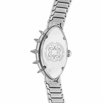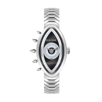 For those who dare to stand out, this 23x40mm Swiss-movement watch offers a striking and contemporary design. The eye-shaped stainless steel case houses a dual-tone black and light blue sapphire dial, creating a modern and captivating aesthetic. 30 VS-1 clarity diamonds are set directly on the dial, lending a touch of sparkle and luxury without overwhelming the clean lines of the design.