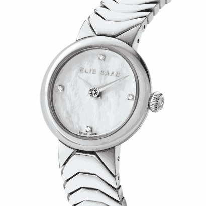 This 31mm Swiss-movement model is adorned in a white mother-of-pearl dial.
