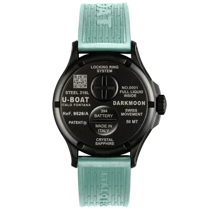 The U-Boat Darkmoon 9526/A features a Swiss-made Ronda 712 quartz movement housed in a 44mm black PVD stainless steel case filled with oil for unmatched dial clarity. Its black domed dial glows with aquamarine Super-Luminova, paired with a matching ultra-resistant silicone strap. Water-resistant to 50M, this innovative timepiece combines bold design and Swiss precision.
