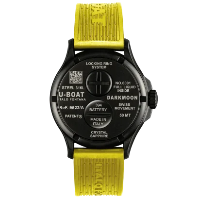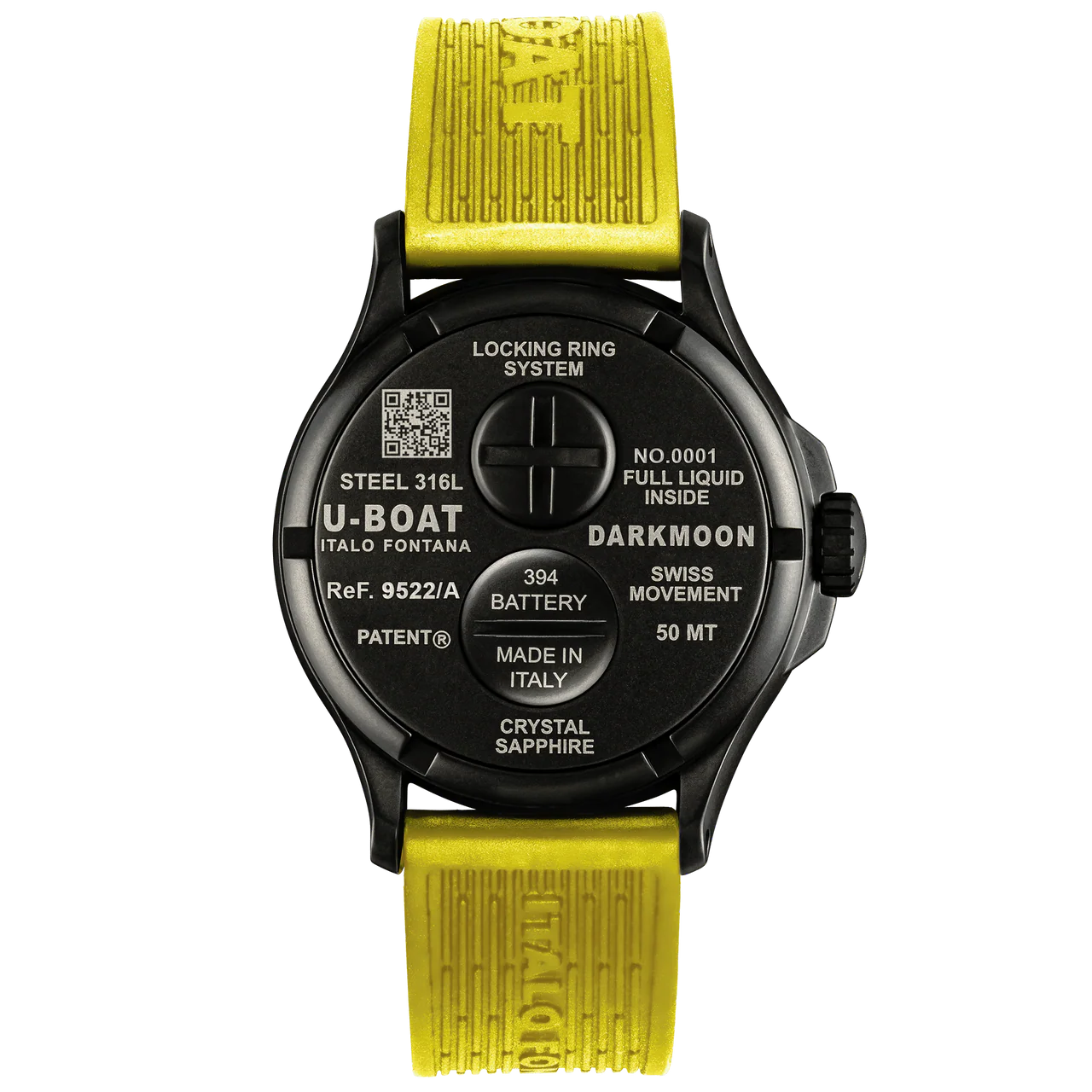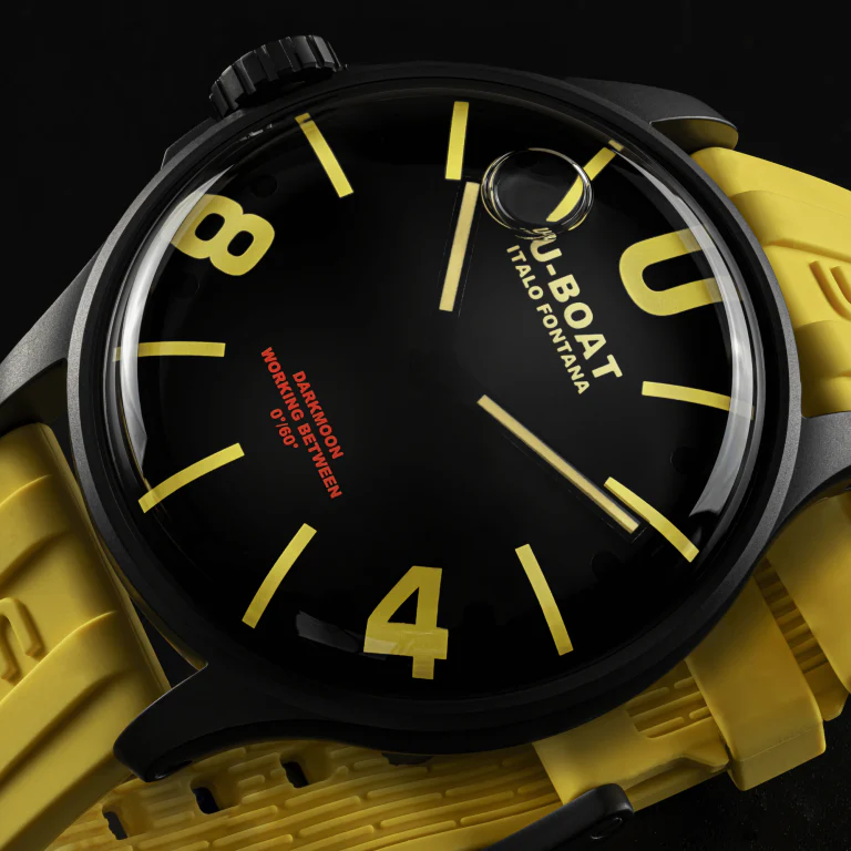 The U-Boat Darkmoon 9522/A showcases a Swiss-made quartz movement in a 44mm black PVD stainless steel case filled with oil for exceptional clarity. Featuring a domed black dial with yellow Super-Luminova and a bold yellow silicone strap, it’s water resistant to 50M and crafted for precision, innovation, and style.