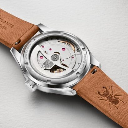 Powered by the automatic Calibre 401, the watch delivers a 120-hour (5-day) power reserve, high antimagnetism, and precise timekeeping with centre hands for hours and minutes, a subsidiary seconds hand at 6 o’clock, and a stop-second function. The movement’s uni-directional rotor ensures reliable winding.